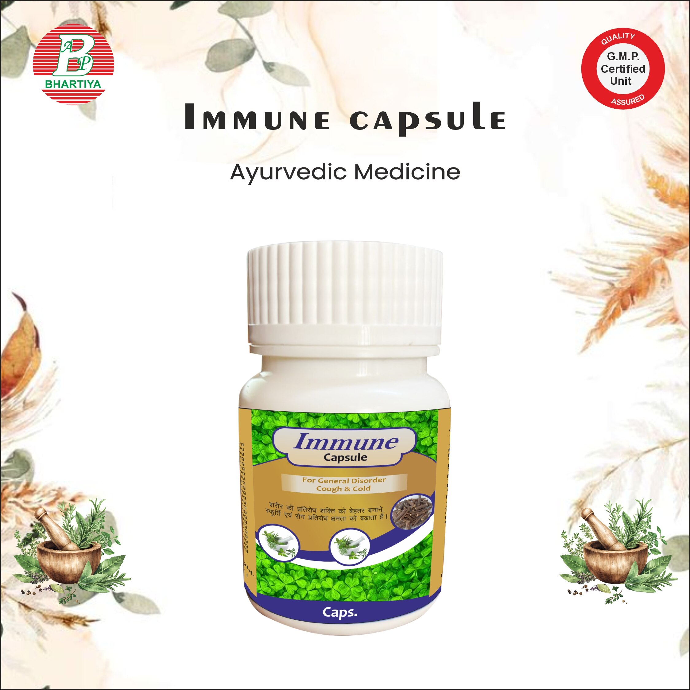 IMMUNE CAPSULE Product Identification • Generic Name: Immune Capsule • Type: Ayurvedic Patent Medicine • Primary Indication Area: Supports Immunity Therapeutic Indications • Useful in the management of weak immunity and frequent infections. Primary benefits: • Strengthens the body’s natural defense system • Supports resistance against common infections like cold, cough, and seasonal illnesses • Boosts energy and vitality • Supports respiratory and overall health Other benefits: • Rich in Antioxidants: The herbal ingredients in Immune Capsule help neutralize free radicals, protecting cells from oxidative stress and supporting long-term health. This helps slow down cellular damage and boosts overall vitality. • Supports Digestive Health: A healthy gut is closely linked to strong immunity. The capsule’s herbs help improve digestion, nutrient absorption, and bowel regularity, which indirectly strengthens the immune system. • Enhances Overall Well-being: By improving energy levels and reducing fatigue, it promotes better physical and mental performance during daily activities. • Supports Respiratory Health: Certain herbs in the formulation help maintain healthy lungs and respiratory function, reducing susceptibility to infections of the respiratory tract. • Balances Body Systems: Ayurvedic herbs help maintain harmony in body systems, promoting general wellness and resilience against stress and illness. • Natural & Gentle: Being herbal and Ayurvedic, it is usually well-tolerated and can be taken regularly as a supportive immunity booster. • May Reduce Frequency of Infections: Regular use may help lower the risk of recurrent minor infections, supporting long-term immune strength. Ingredients: Arjun Chhal • Botanical Name: Terminalia arjuna • Key Constituents: Key Constituents: • Tannins • Flavonoids • Saponins • Phenolic compounds Mechanism of action in immunity The antioxidants in Arjun bark fight harmful free radicals. o This keeps immune cells safe and healthy. 2. Boosts immune cells o Saponins and flavonoids help immune cells work better. o They increase antibody production and strengthen the body’s defense. Haldi (Turmeric) Botanical Name: Curcuma longa Key Constituents: • Curcumin • Volatile oils (like turmerone) • Flavonoids • Phenolic compounds Mechanism of Action in Immunity 1. Protects body cells o Curcumin is a strong antioxidant that fights free radicals. o Keeps immune cells healthy and prevents cellular damage. 2. Boosts immune response o Stimulates activation of immune cells like T-cells, B-cells, and natural killer (NK) cells. o Enhances antibody production. Tulsi (Holy Basil) Botanical Name: Ocimum sanctum / Ocimum tenuiflorum Key Constituents: Flavonoids, Phenolic acids, Eugenol, Tannins, Vitamins (C, A) Mechanism of Action as an Antioxidant – Biochemistry / Pharmacology 1. Stops Free Radicals: • Flavonoids and phenolic acids remove harmful molecules called free radicals, protecting cells from damage. 2. Protects Cell Membranes: • Compounds like eugenol prevent damage to cell membranes caused by oxidation. Amla (Indian Gooseberry) Botanical Name: Phyllanthus emblica / Emblica officinalis Key Constituents: Vitamin C, Flavonoids, Tannins, Phenolic compounds, Gallic acid Mechanism of Action as an Antioxidant – Biochemistry / Pharmacology 1. Free Radical Scavenging: • Vitamin C and flavonoids remove harmful free radicals, protecting cells from oxidative damage. 2. Protects Cell Membranes: • Phenolic compounds prevent damage to cell membranes and tissues caused by oxidation. Mulethi (Licorice) Botanical Name: Glycyrrhiza glabra Key Constituents: Glycyrrhizin, Flavonoids, Saponins, Tannins, Phenolic compounds Mechanism of Action in Immunity – Biochemistry / Pharmacology 1. Immune System Modulation: • Glycyrrhizin and flavonoids enhance activity of immune cells like macrophages, natural killer (NK) cells, and T-lymphocytes, helping the body fight infections. 2. Anti-Inflammatory Effect: • Suppresses pro-inflammatory cytokines (TNF-α, IL-1β, IL-6) and inhibits NF-κB signaling, reducing inflammation during infections. Dalchini (Cinnamon) Botanical Name: Cinnamomum verum / Cinnamomum zeylanicum Key Constituents: Cinnamaldehyde, Eugenol, Flavonoids, Tannins, Phenolic acids Mechanism of Action in Immunity – Biochemistry / Pharmacology 1. Immune Modulation: • Flavonoids and cinnamaldehyde enhance activity of immune cells like macrophages and T-lymphocytes, improving the body’s defense against infections. 2. Anti-Inflammatory Effect: • Suppresses pro-inflammatory cytokines (TNF-α, IL-1β, IL-6) and inhibits NF-κB signaling, reducing inflammation. Giloy (Tinospora cordifolia) Botanical Name: Tinospora cordifolia Key Constituents: Alkaloids (tinosporine), Glycosides, Steroids, Flavonoids, Polysaccharides Mechanism of Action in Immunity – Biochemistry / Pharmacology 1. Immune System Modulation: • Polysaccharides and glycosides enhance the activity of macrophages, T-lymphocytes, and natural killer (NK) cells, boosting the body’s defense against infections. 2. Anti-Inflammatory Effect: • Suppresses pro-inflammatory cytokines (TNF-α, IL-1β, IL-6) and inhibits NF-κB signaling, reducing tissue inflammation. Bhringraj (Eclipta alba) Botanical Name: Eclipta alba / Eclipta prostrata Key Constituents: Wedelolactone, Flavonoids, Alkaloids, Coumestans, Triterpenoids Mechanism of Action in Immunity – Biochemistry / Pharmacology 1. Immune System Modulation: • Flavonoids and wedelolactone enhance macrophage and lymphocyte activity, strengthening the body’s defense mechanisms. 2. Anti-Inflammatory Effect: • Inhibits pro-inflammatory cytokines (TNF-α, IL-1β, IL-6) and NF-κB signaling, reducing tissue inflammation. Punarnava (Boerhavia diffusa) Botanical Name: Boerhavia diffusa Key Constituents: Alkaloids (boeravinone), Flavonoids, Glycosides, Sterols, Phenolic compounds Mechanism of Action in Immunity 